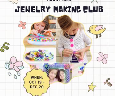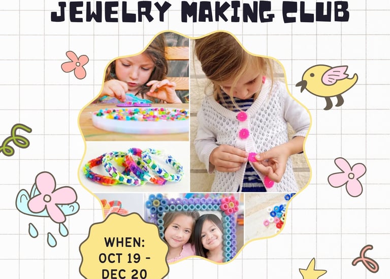 Calling all creative kids! Join us for a sparkly, stretchy, and super fun jewelry-making adventure! Each week, we’ll dive into a new project—from colorful Rainbow Loom bracelets to bead-stringing masterpieces and charm-packed creations. Whether you're a beginner or a budding designer, you'll get to explore different materials, learn cool techniques, and take home your own handmade treasures.